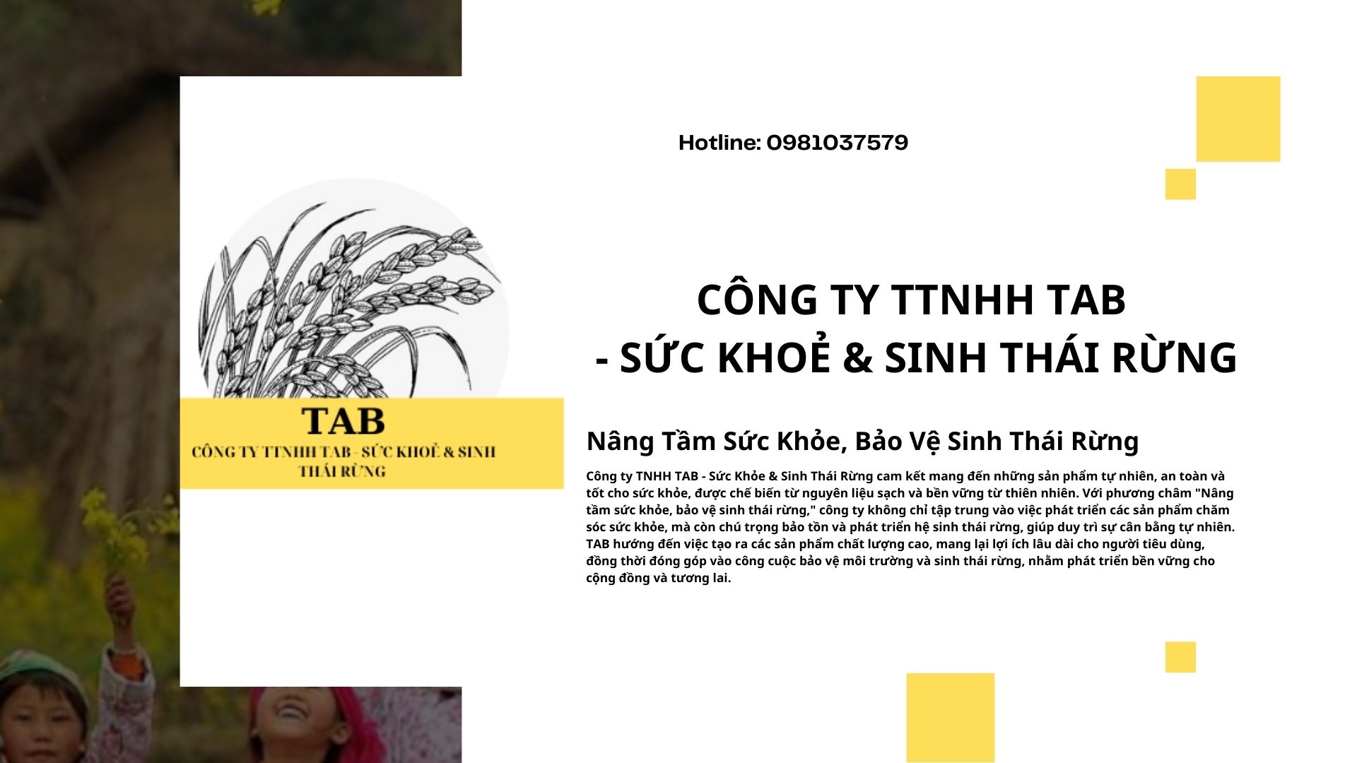 Công ty TNHH TAB cam kết sản xuất các dòng rượu chất lượng cao từ nguyên liệu nếp sạch, nước ngầm tinh khiết và các dược liệu thiên nhiên quý. Kết hợp giữa bí quyết truyền thống và công nghệ hiện đại, chúng tôi tạo ra những sản phẩm an toàn, thơm ngon và tốt cho sức khỏe. Không chỉ chú trọng chất lượng, TAB còn đề cao trách nhiệm xã hội với cam kết bảo vệ môi trường, phát triển bền vững, bảo tồn sinh thái rừng và mang lại lợi ích lâu dài cho cộng đồng tiêu dùng. TAB hướng đến trở thành doanh nghiệp tiên phong trong lĩnh vực rượu sức khỏe nguồn gốc tự nhiên – một thương hiệu Việt mang dấu ấn bản địa, gắn kết giữa chất lượng, sinh thái và con người. Mỗi giọt rượu TAB không chỉ là hương vị, mà còn là sự lan tỏa của triết lý sống lành mạnh, trân trọng thiên nhiên và gìn giữ giá trị văn hóa truyền thống.
